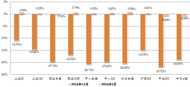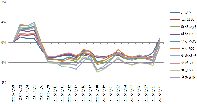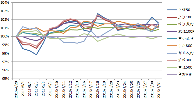 5月沪深两市小幅上涨,覆盖两市的申万A指跌幅为0.64%。指数方面,本期核心市场指数中,仅中证500略微下跌,跌幅为-0.64%;创业板指表现最好,上涨0.98%。