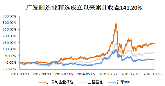 广发制造业精选主要投资于竞争优势强、业绩确定的制造业优质成长类股票,同时结合基本面和估值变化,灵活调整仓位。自2011年9月20日成立以来一直表现稳健,截至2016.11.9,累计收益率141.20%,年化收益率18.66%,大幅跑赢市场基准,超额收益明显。