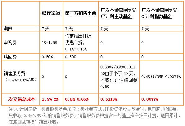(3)而广发基金直销平台(APP、官网、官微)的C计划是适合短线投资的省钱利器。通过购买C计划的指数基金,投资者免收申购费和赎回费,仅仅按照你持有期限收取销售服务费,按你持有期限计算,销售服务费0.4%/年,也就是你持有一年的话费用成本也就0.4%,若持有七天的话,那你的总的费率成本为0.4%*7/365=0.0077%,一次完整交易总成本万分之一的成本都不到,比在场内购买基金的交易手续费都低。另外,老罗想强调下,广发基金直销平台(APP、官网、官微)的主动基金持有期限低于30天,需要收取0.5%的惩罚性费用,而指数基金基金不收取惩罚性费用,仅收C计划按照时间计算的费用。当然这个C计划是按照你持有时间计算的,持有时间越短,费率越低,时间越长,费率越高,投资者可以根据自己的交易习惯选择自己的平台进行交易。