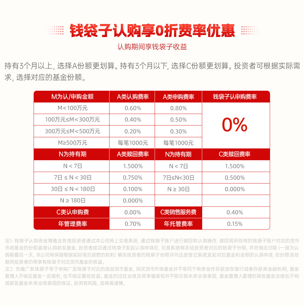 钱袋子认购享0折费率优惠,认购期间享钱袋子收益