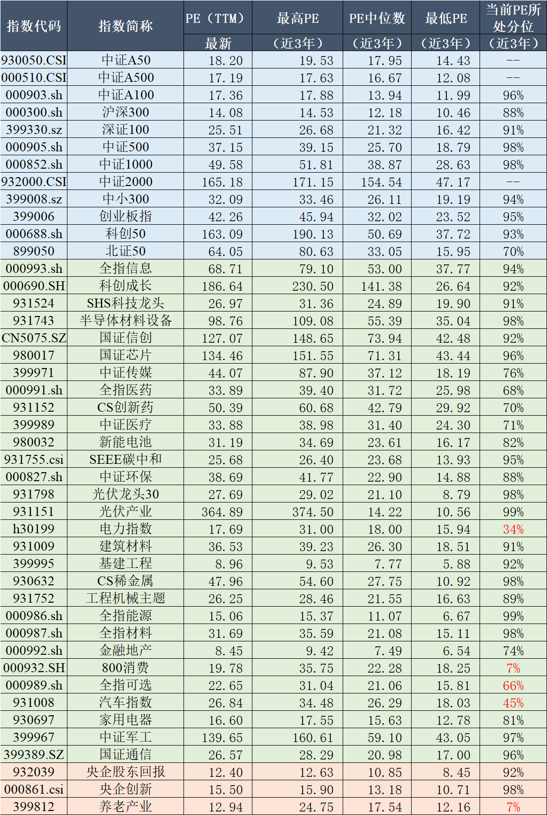 旗下产品跟踪指数近三年PE情况及当前所处位置