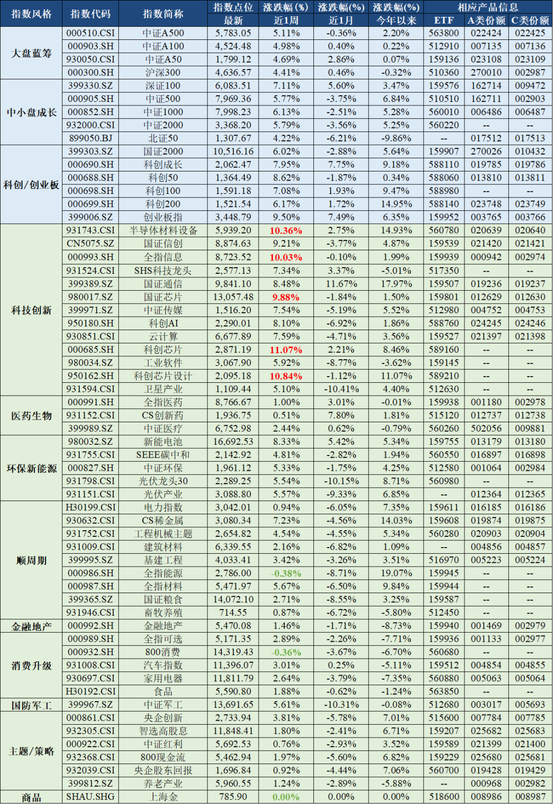 在板块表现方面,创业板指上涨9.50%,深证成指上涨7.16%,上证指数上升涨2.74%,科创50上涨8.62%。规模指数方面,中证1000指数上涨6.13%,中证A500指数上涨5.11%,沪深300指数上涨4.41%,中证500指数上涨5.77%。