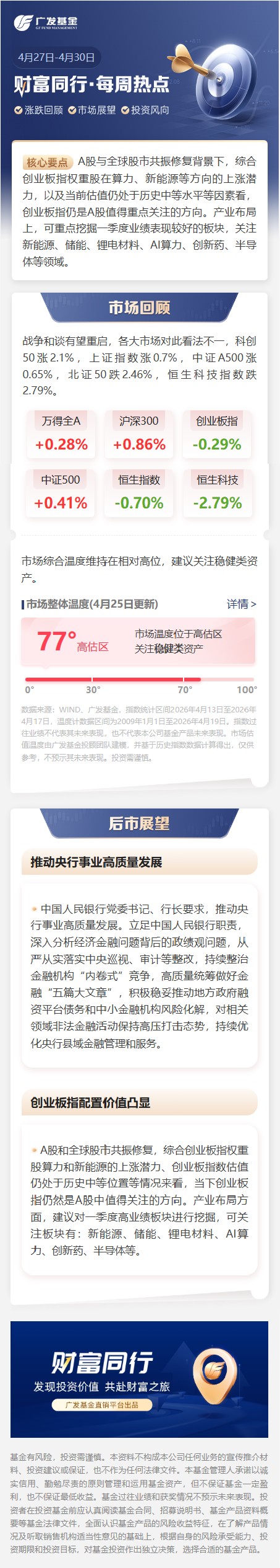 全球股市共振修复,综合权重股上涨潜力、指数估值等,当下创业板指仍然是值得关注的方向。产业布局方面,建议对一季度高业绩板块进行挖掘。